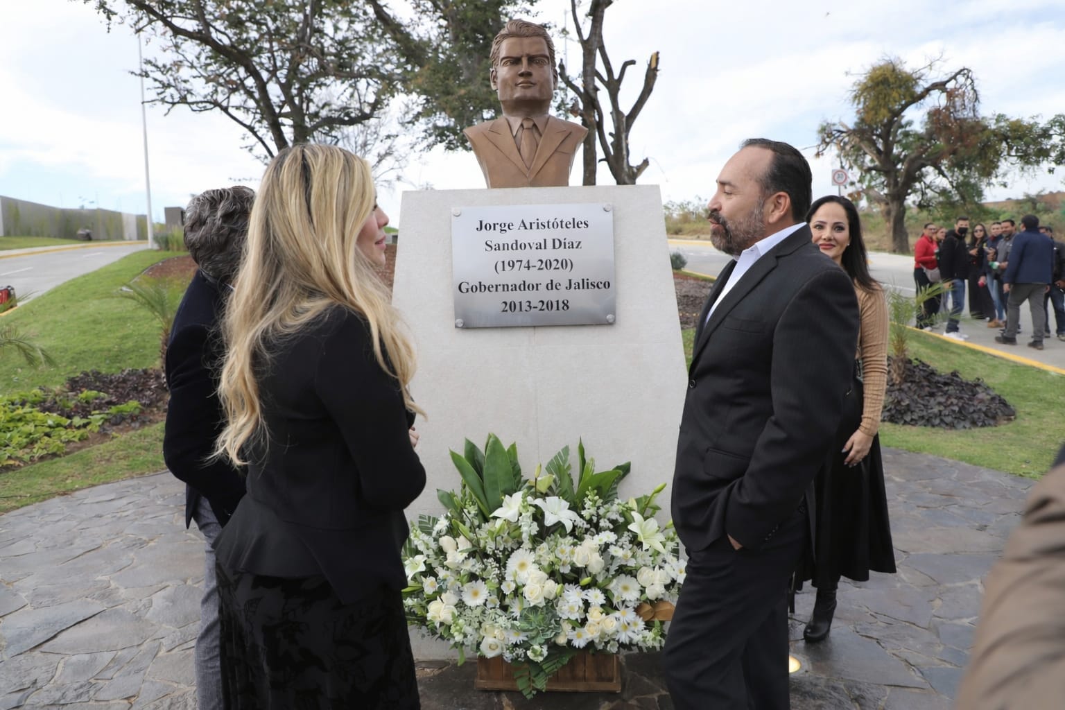 Durante la ceremonia, realizada esta mañana, el presidente municipal Sergio Chávez Dávalos, en compañía del gobernador Pablo Lemus, la viuda del exgobernador Lorena Arriaga, realizaron la develación de un busto conmemorativo, así como el nombramiento oficial de la avenida “Jorge Aristóteles Sandoval Díaz”, con lo cual se honra y preserva su legado en la historia del municipio.
